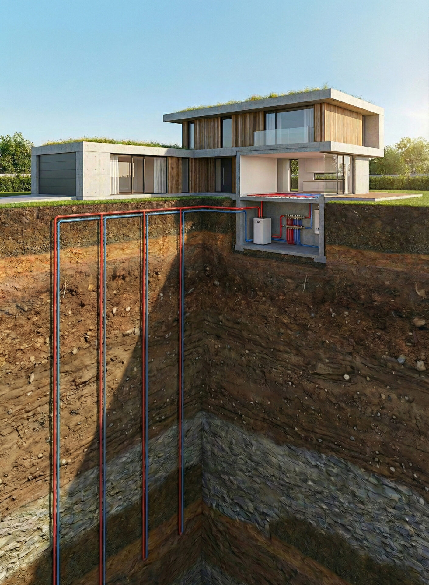 Een geothermische warmtepomp haalt warmte uit de bodem, waar de temperatuur het hele jaar stabiel blijft. Via een gesloten circuit wordt deze energie naar de warmtepomp geleid en opgewaardeerd tot bruikbare warmte voor verwarming van je woning, sanitair warm water of je zwembad.